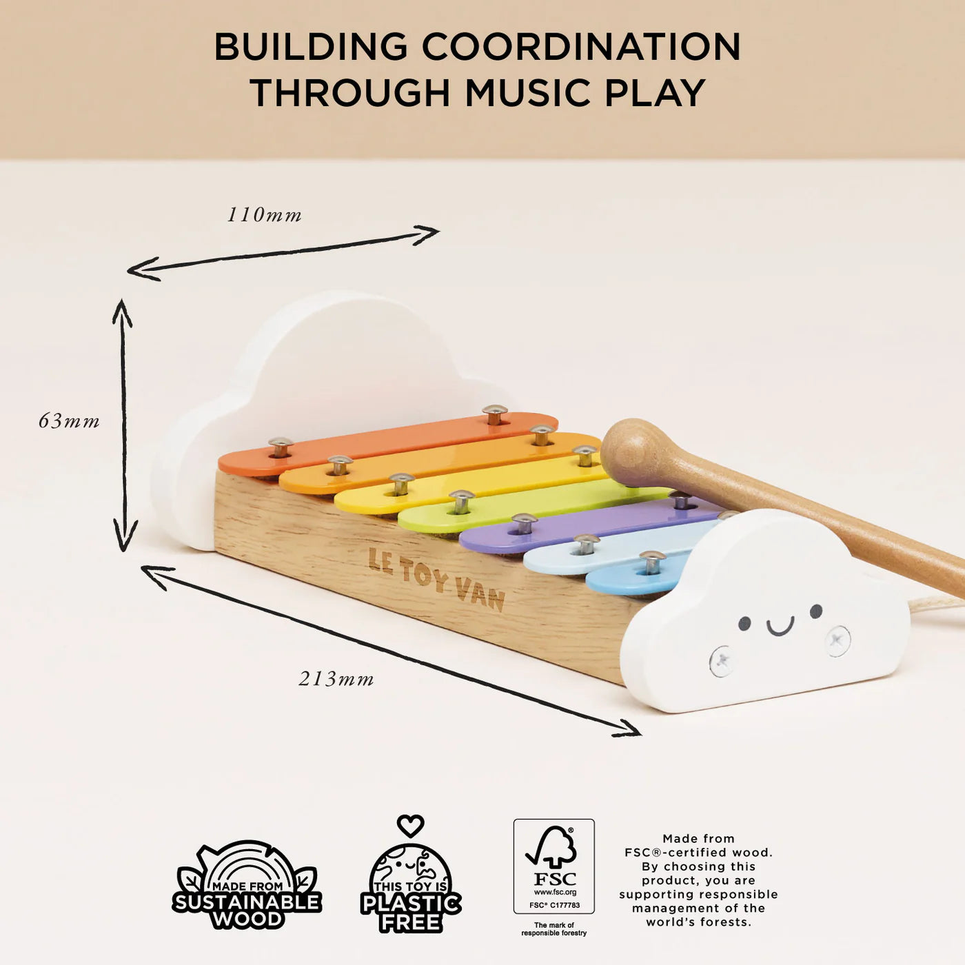 Encourage an interest in music with this delightful xylophone toy, just the ticket for learning about sounds from an early age. This plastic free toy is crafted from a mix of FSC®-certified wood and metal and includes a musical stick for tapping out a melody. The sweet cloud design and colourful keys will appeal to your tiny musicians as they practice honing their dexterity and grasping skills with this lovely traditional instrument.